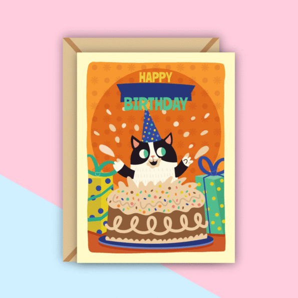 Hovering boldly above the action, the words “HAPPY BIRTHDAY” are emblazoned across the Cat With Cake Greeting Card in a mix of yellow and teal typography. The text is set against a dark blue ribbon banner, anchoring the design with a classic party element that feels timeless yet fresh. The font is bold and cheerful, matching the loud personality of the tuxedo cat perfectly. It is a design choice in the Cat With Cake Greeting Card that ensures the message is clear: today is a big deal, and it deserves to be celebrated with volume and verve.