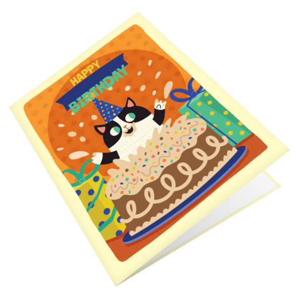 Beyond its visual appeal, the Cat With Cake Greeting Card offers a tactile experience that speaks to quality and care. The card is printed on premium, heavy-stock paper that feels substantial in the hand, with a smooth finish that allows the vibrant orange and blue hues to pop without glare. Holding the Cat With Cake Greeting Card feels like holding a piece of art, a durable token of affection that won’t bend or fade easily. It is a physical object that conveys the weight of your friendship and the effort you took to find something special within the Skypopcards collection.
