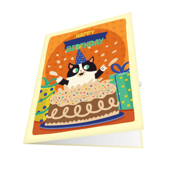 Furthermore, the Cat With Cake Greeting Card is destined to become a keepsake rather than something discarded after the event. Its vibrant colors and adorable subject matter make it impossible to throw away, turning it into a piece of decor. It is the kind of card that ends up pinned to a corkboard, stuck to a fridge with a magnet, or framed on a desk for months. Every time the recipient glances at the Cat With Cake Greeting Card in the weeks following their birthday, they will get a fresh hit of dopamine, a reminder of the fun they had.