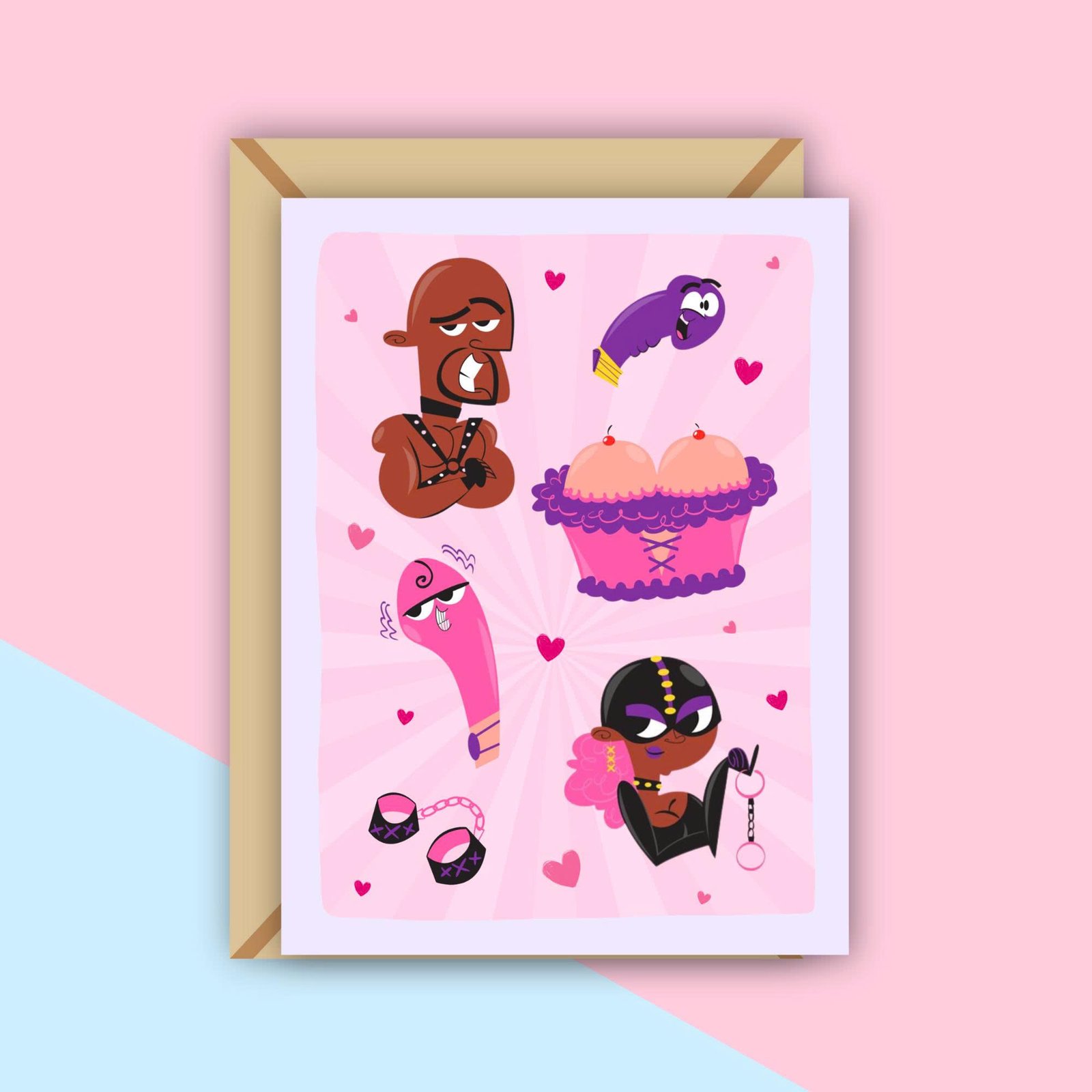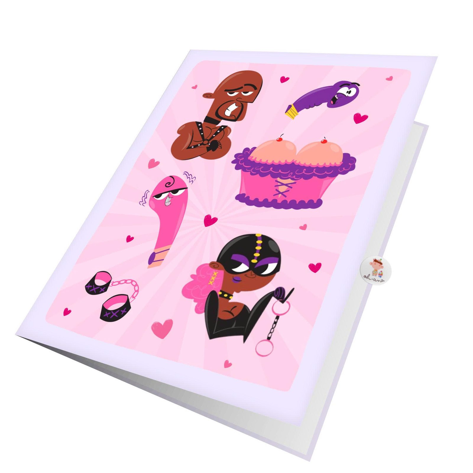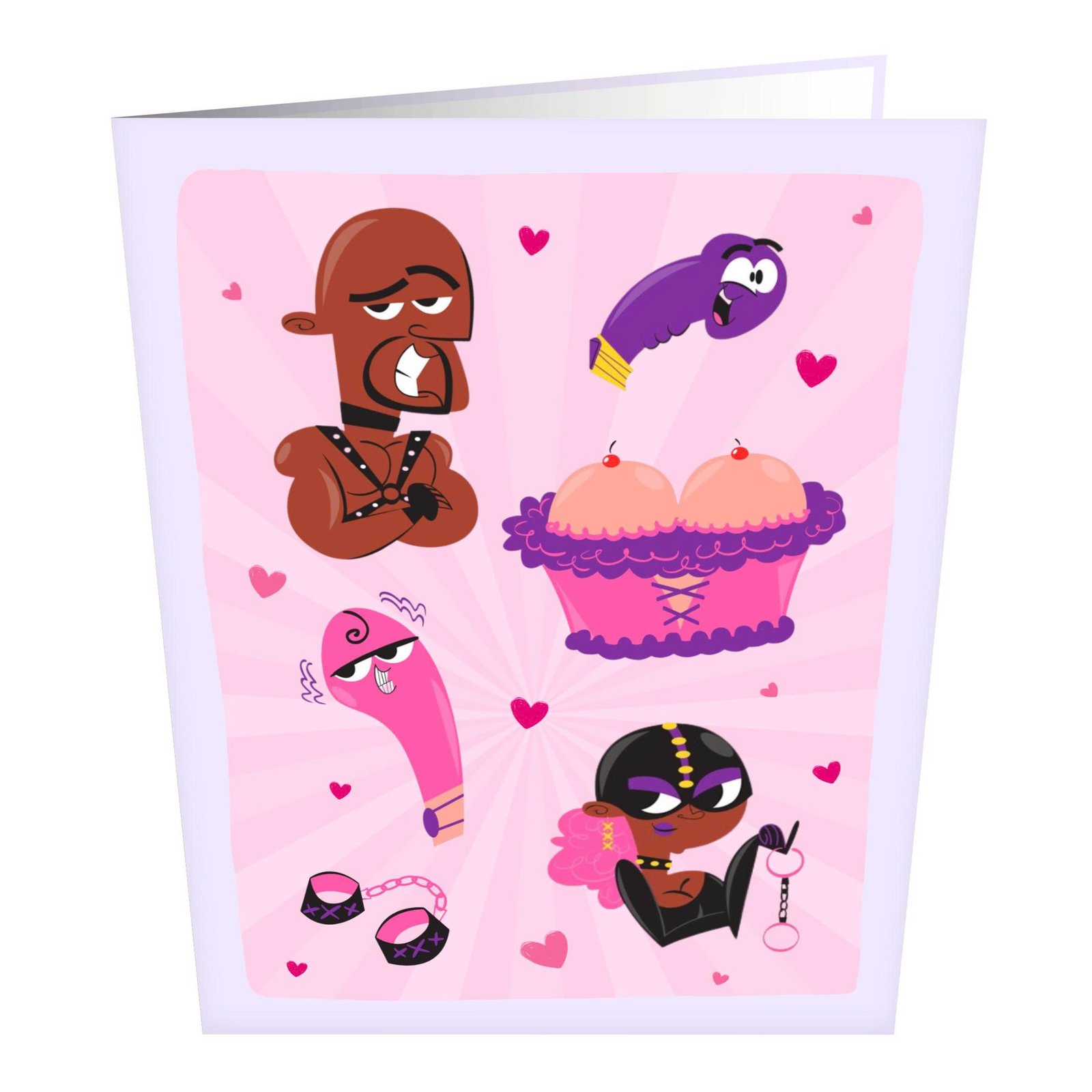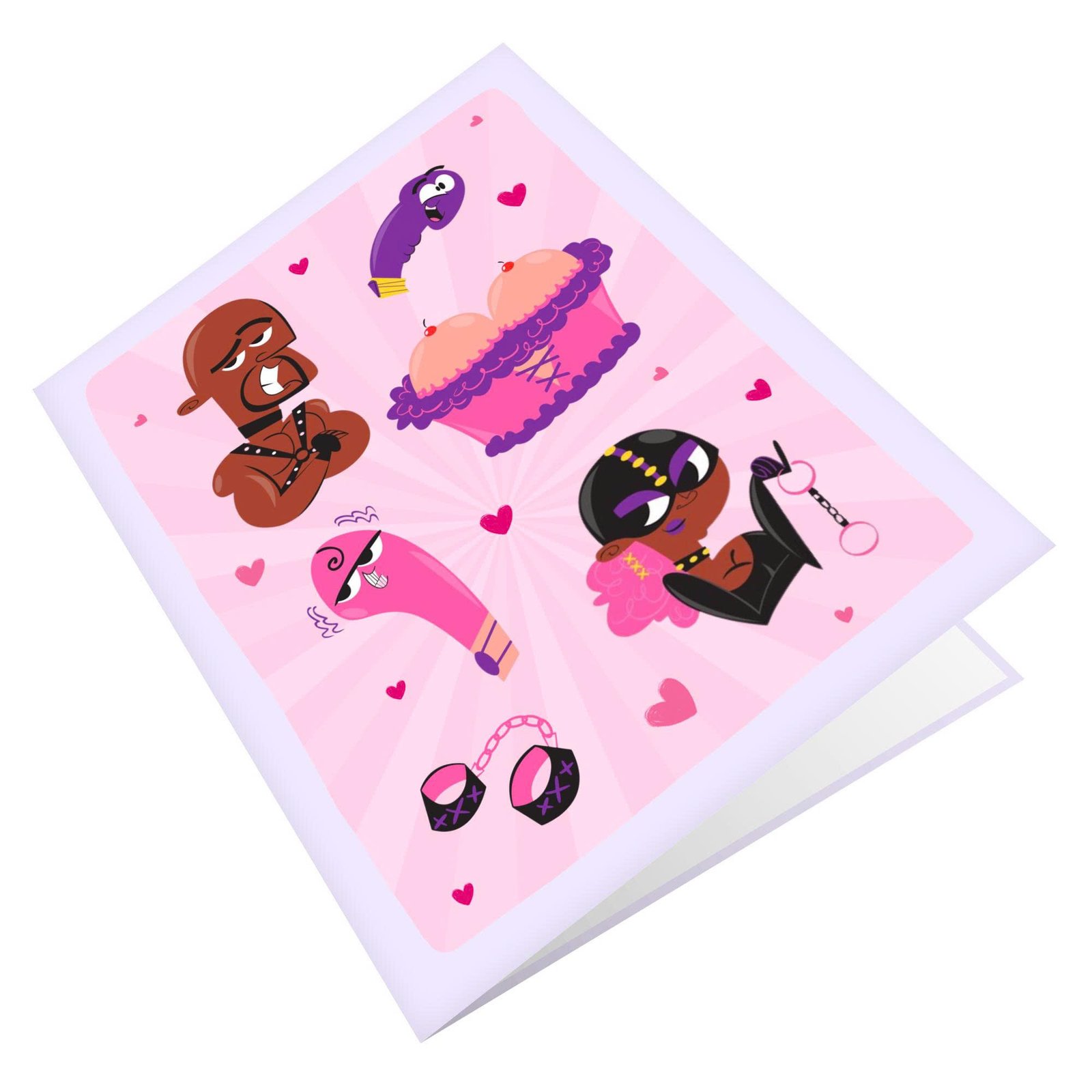 The front cover presents a clever and stylized design, often using abstract shapes, cartoon forms, or symbolic elements like cupcakes, balloons, or playful icons arranged in a humorous way. Soft pastels or bold pop colors such as blush pink, nude beige, coral, and cream keep the mood light, friendly, and fun rather than explicit. The design feels witty and modern, instantly letting the recipient know this card is meant to make them smile.