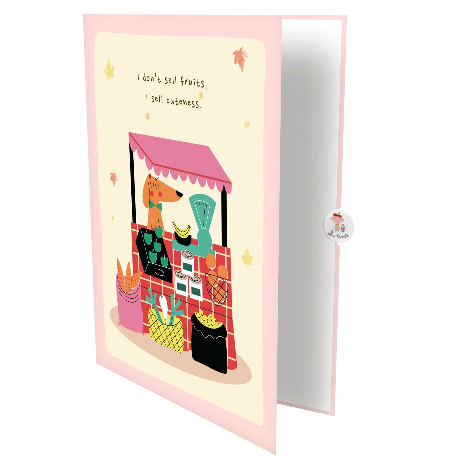 Open the card, and a delightful grocery scene unfolds inside. The dog appears at the heart of the moment, surrounded by shelves, baskets, fruits, or simple household items that feel familiar and comforting. The scene celebrates companionship rather than action, making the moment feel slow, sweet, and quietly joyful.