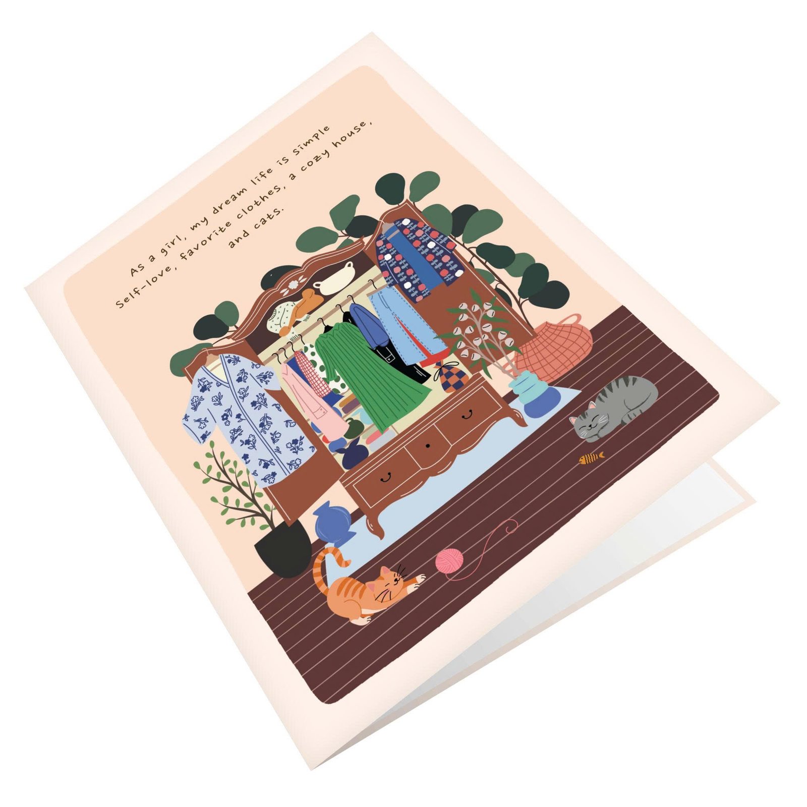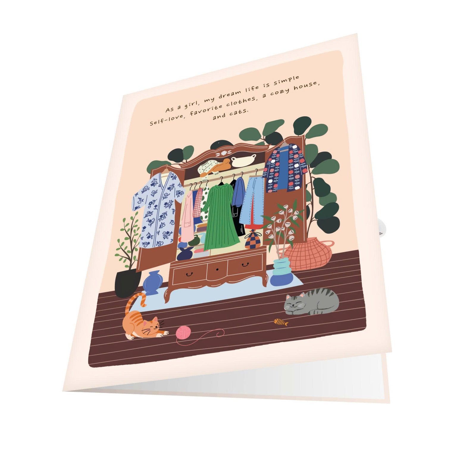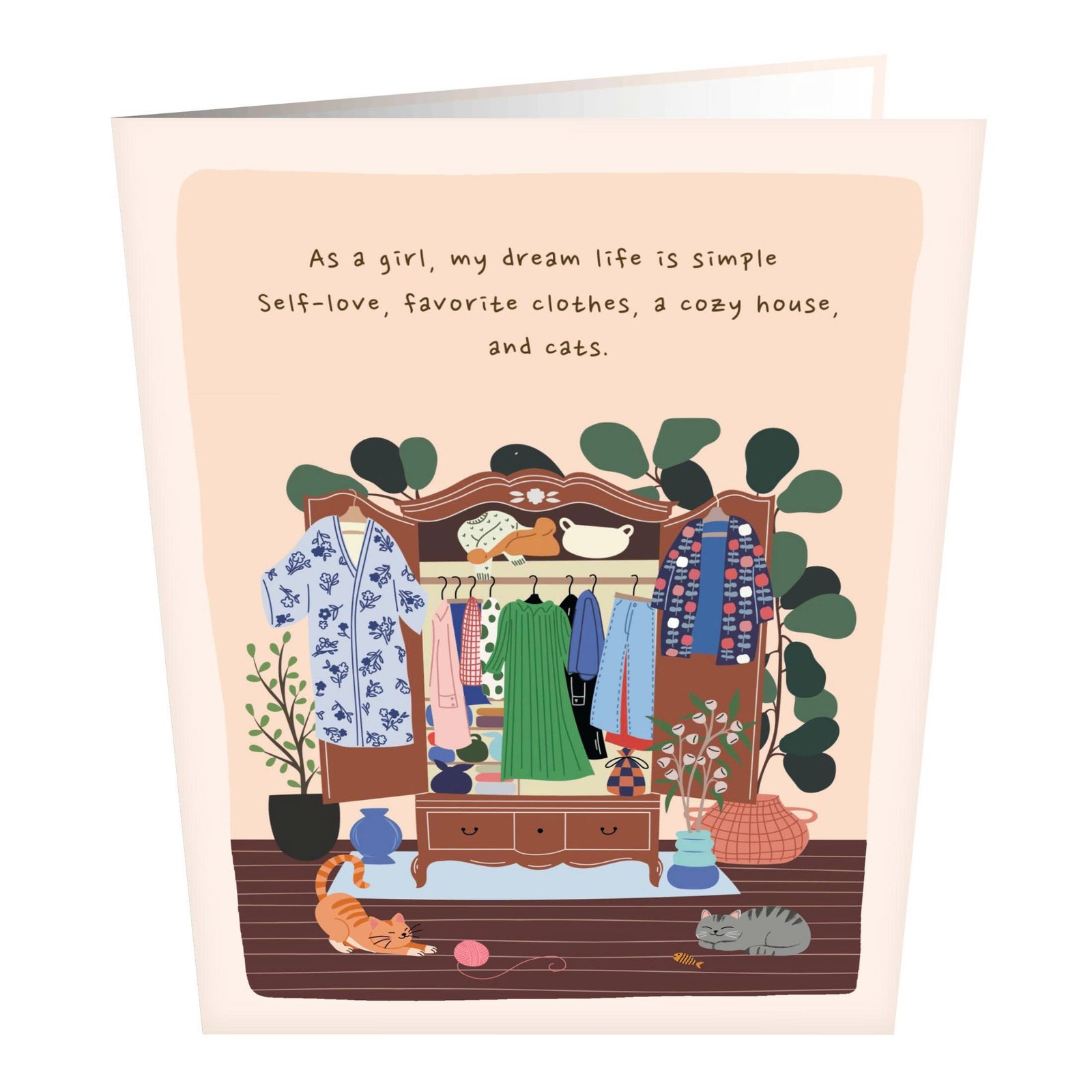 Open the card, and a delightful scene unfolds inside, highlighting a girl enjoying her moment with comfort and confidence. Flowing dresses, cute tops, patterned skirts, or cozy layers are illustrated with care, creating movement and personality in the scene. The atmosphere feels light and positive, like a snapshot of happiness in everyday life.