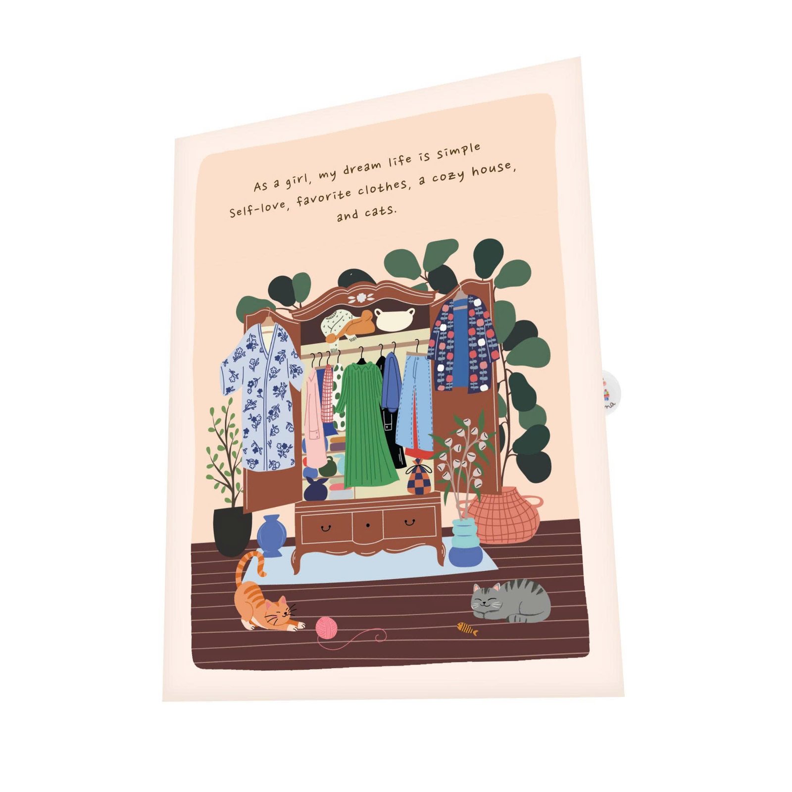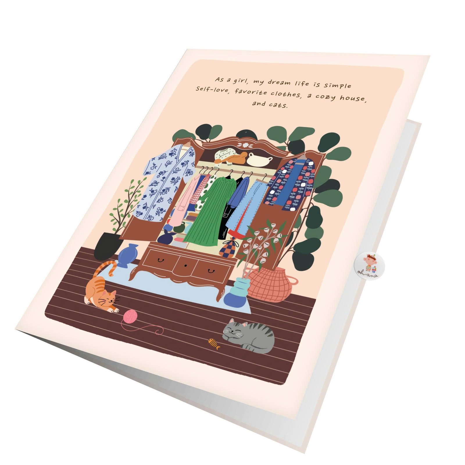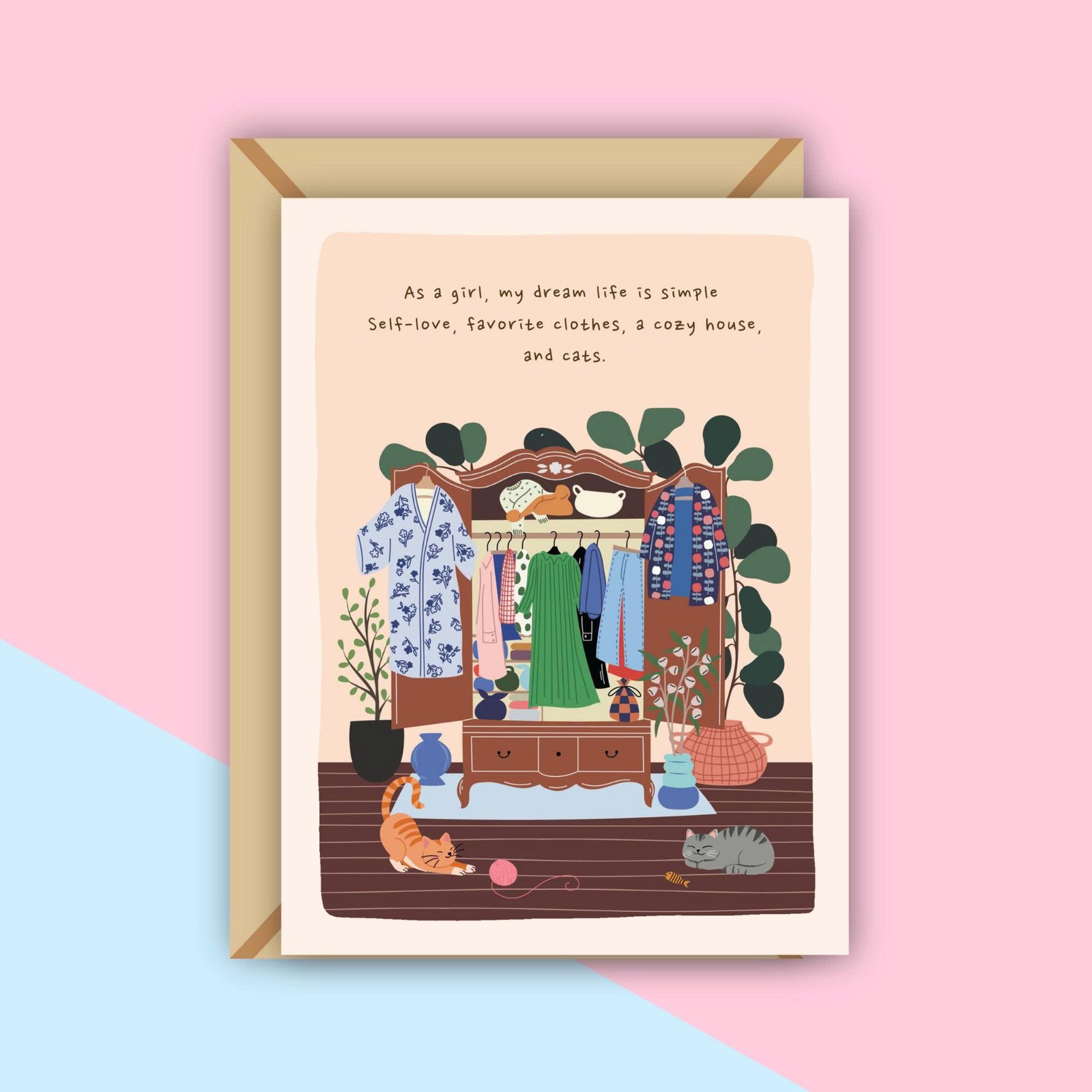 Open the card, and a delightful scene unfolds inside, highlighting a girl enjoying her moment with comfort and confidence. Flowing dresses, cute tops, patterned skirts, or cozy layers are illustrated with care, creating movement and personality in the scene. The atmosphere feels light and positive, like a snapshot of happiness in everyday life.