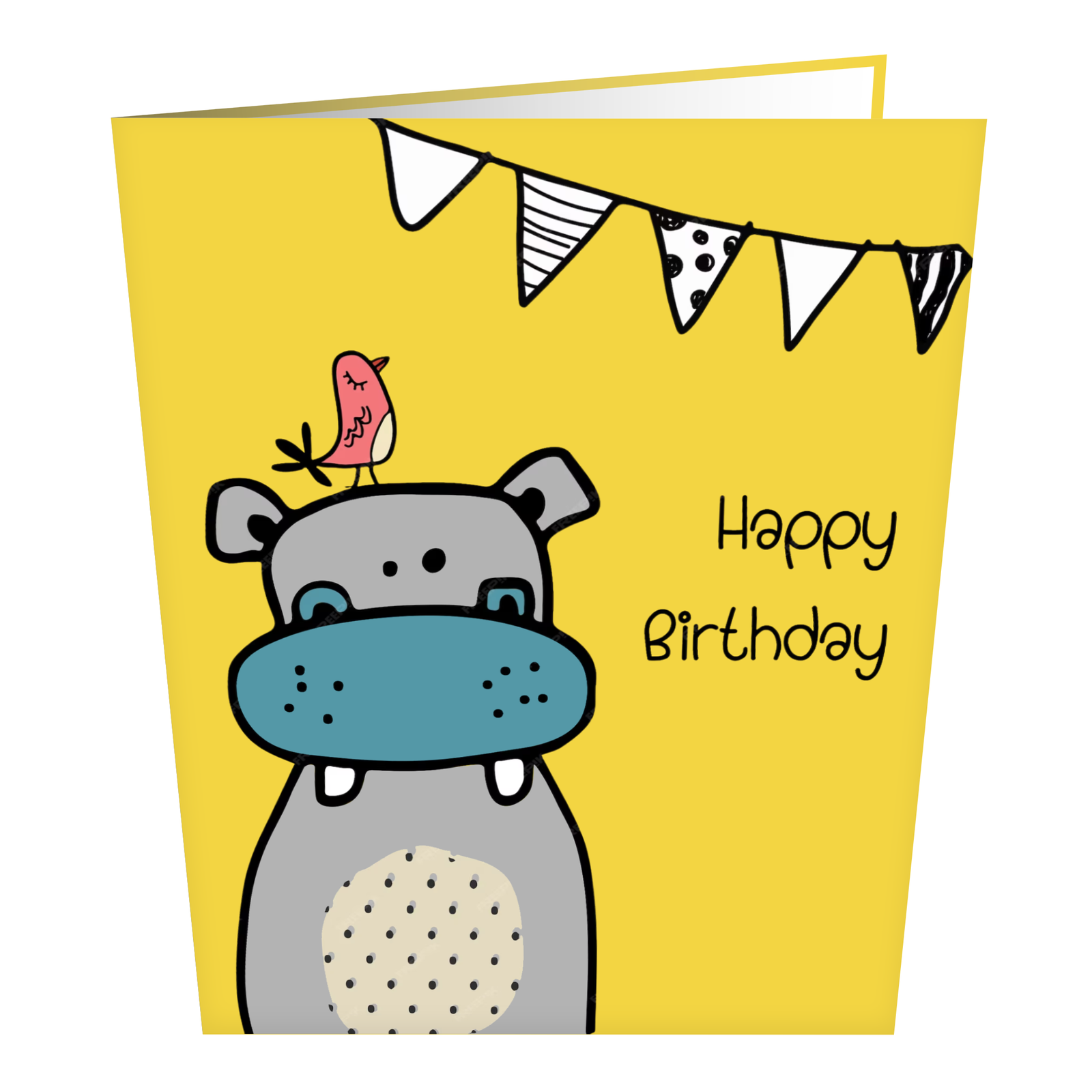 Each layer adds character and depth, from the rounded shapes of the hippo to the textured cake and playful decorations. The expressions are lively, the poses are fun, and the overall composition radiates warmth and humor. A special space awaits your personal message, ready to carry birthday wishes filled with laughter, love, and celebration.