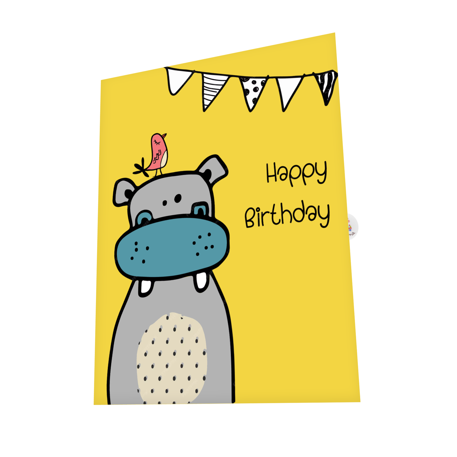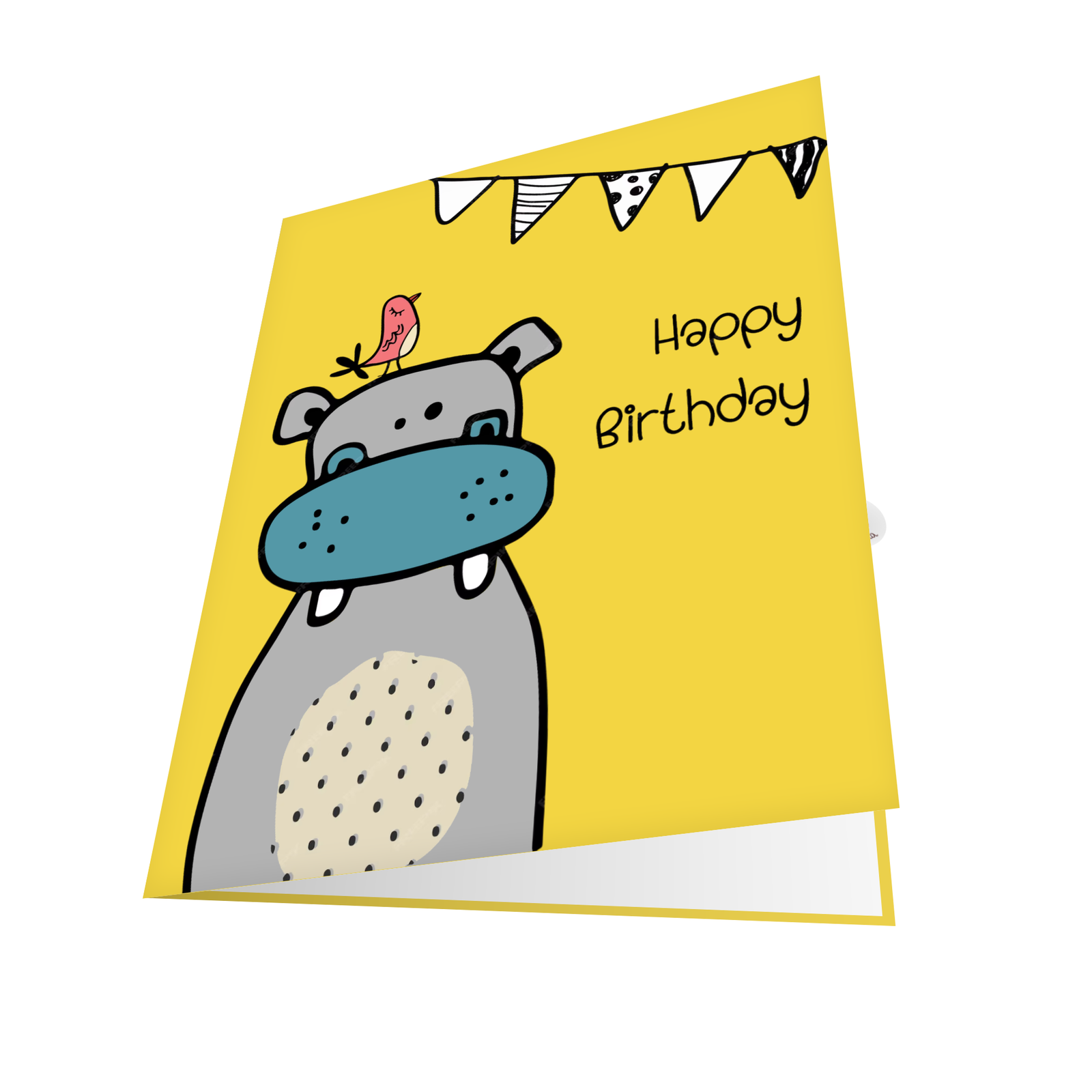 The cover reveals a lovable hippo in a fun birthday pose, perhaps wearing a party hat, holding balloons, or standing beside a colorful birthday cake. Bright yet gentle colors like sky blue, soft purple, sunny yellow, and creamy white create a lively and welcoming atmosphere. The illustration feels cheerful and expressive, instantly spreading good vibes the moment the card is seen.