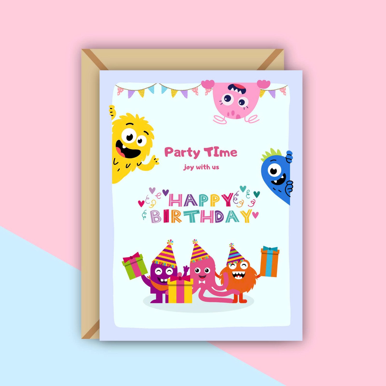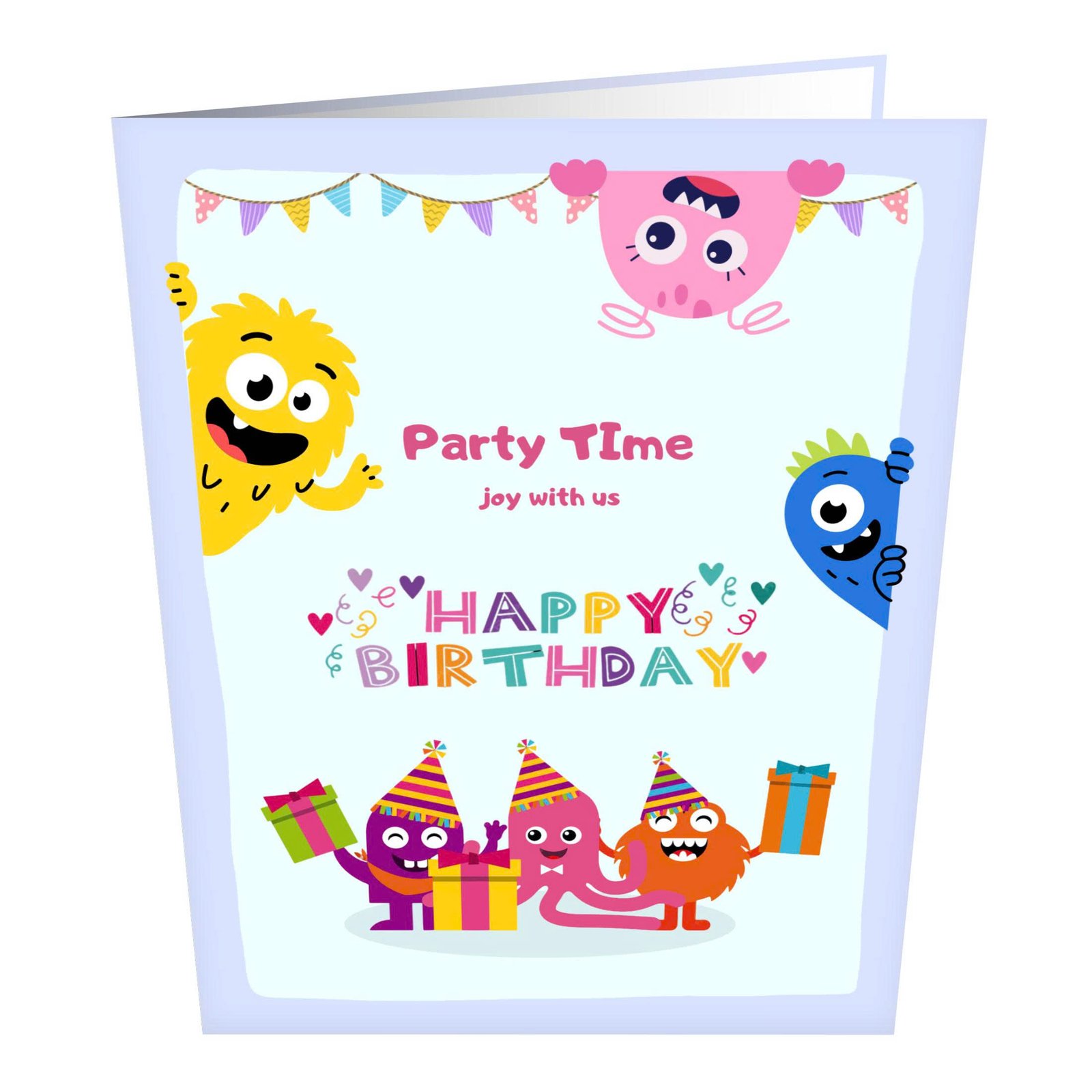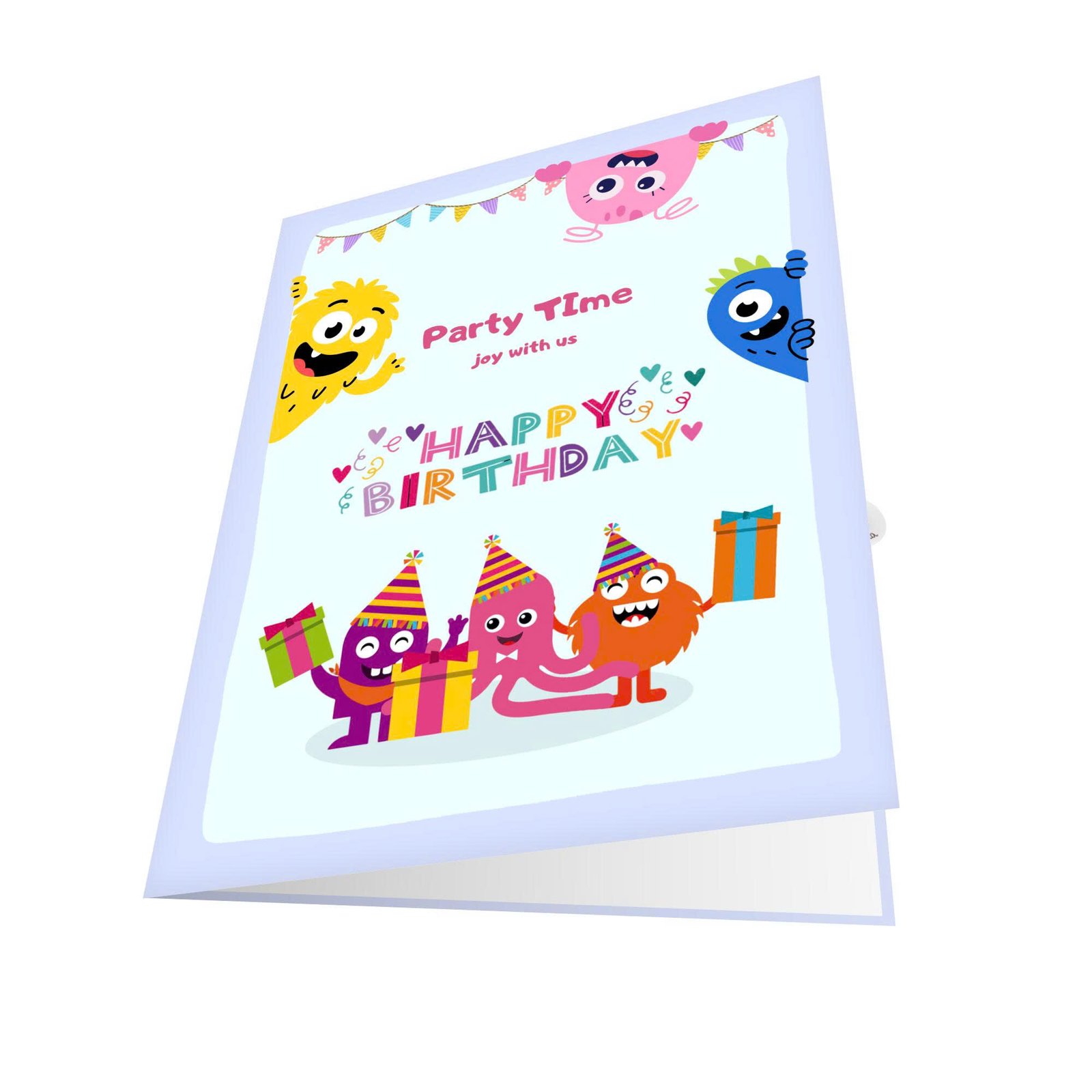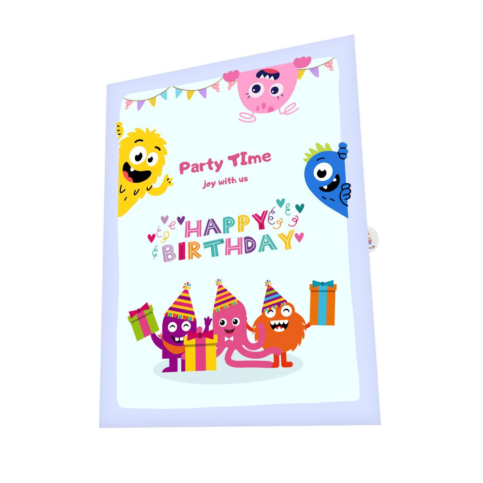 Every detail adds to the playful spirit, from quirky eyes and tiny teeth to wiggly arms and colorful party props. The composition feels fun and welcoming, while a clear space is left for your personal message, perfect for writing silly wishes, warm birthday notes, or encouraging words filled with joy.