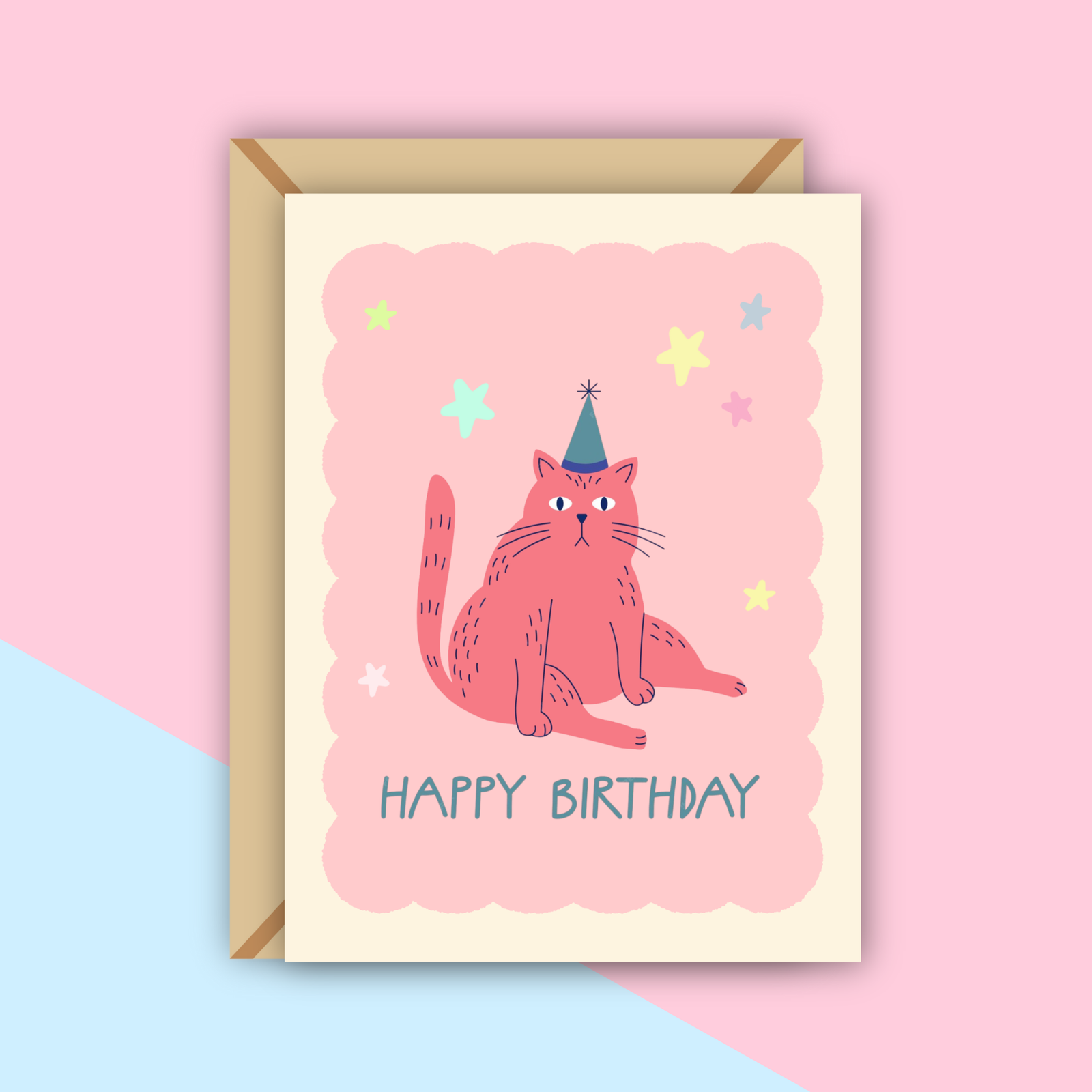 Each layer adds depth and personality, from the rounded cheeks of the cat to the textured frosting of the cake and the floating shapes around it. The pink palette enhances the feeling of sweetness and joy, making the moment feel extra special and heartwarming. A thoughtfully placed space awaits your personal message, ready to hold wishes of happiness, love, and gentle celebration.